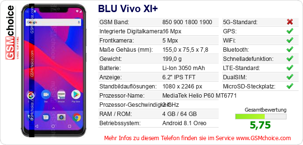 Hast du eigene Webseite? Willst du die Informationen über Standarddaten des Handys BLU Vivo XI+ irgendwo veröffentlichen? Das ist sehr einfach. Du kannst das Bild herunterladen oder kopieren und auf der Webseite folgenden Code hinzufügen:Das Einfügen von diesem Code verursacht das Anzeigen von dem folgenden Bild: