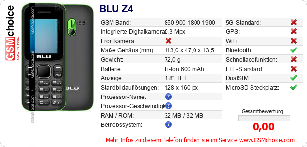 Hast du eigene Webseite? Willst du die Informationen über Standarddaten des Handys BLU Z4 irgendwo veröffentlichen? Das ist sehr einfach. Du kannst das Bild herunterladen oder kopieren und auf der Webseite folgenden Code hinzufügen:Das Einfügen von diesem Code verursacht das Anzeigen von dem folgenden Bild: