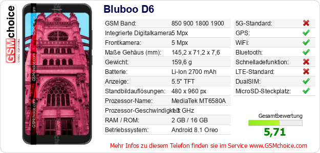 Hast du eigene Webseite? Willst du die Informationen über Standarddaten des Handys Bluboo D6 irgendwo veröffentlichen? Das ist sehr einfach. Du kannst das Bild herunterladen oder kopieren und auf der Webseite folgenden Code hinzufügen:Das Einfügen von diesem Code verursacht das Anzeigen von dem folgenden Bild: