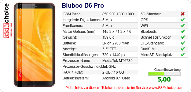 Hast du eigene Webseite? Willst du die Informationen über Standarddaten des Handys Bluboo D6 Pro irgendwo veröffentlichen? Das ist sehr einfach. Du kannst das Bild herunterladen oder kopieren und auf der Webseite folgenden Code hinzufügen:Das Einfügen von diesem Code verursacht das Anzeigen von dem folgenden Bild:
