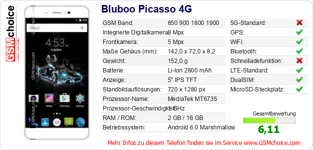 Hast du eigene Webseite? Willst du die Informationen über Standarddaten des Handys Bluboo Picasso 4G irgendwo veröffentlichen? Das ist sehr einfach. Du kannst das Bild herunterladen oder kopieren und auf der Webseite folgenden Code hinzufügen:Das Einfügen von diesem Code verursacht das Anzeigen von dem folgenden Bild:
