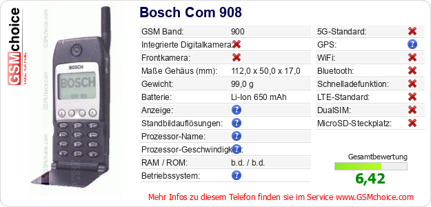 Hast du eigene Webseite? Willst du die Informationen über Standarddaten des Handys Bosch Com 908 irgendwo veröffentlichen? Das ist sehr einfach. Du kannst das Bild herunterladen oder kopieren und auf der Webseite folgenden Code hinzufügen:Das Einfügen von diesem Code verursacht das Anzeigen von dem folgenden Bild:
