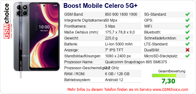 Hast du eigene Webseite? Willst du die Informationen über Standarddaten des Handys Boost Mobile Celero 5G+ irgendwo veröffentlichen? Das ist sehr einfach. Du kannst das Bild herunterladen oder kopieren und auf der Webseite folgenden Code hinzufügen:Das Einfügen von diesem Code verursacht das Anzeigen von dem folgenden Bild: