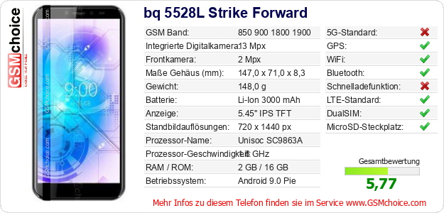 Hast du eigene Webseite? Willst du die Informationen über Standarddaten des Handys bq 5528L Strike Forward irgendwo veröffentlichen? Das ist sehr einfach. Du kannst das Bild herunterladen oder kopieren und auf der Webseite folgenden Code hinzufügen:Das Einfügen von diesem Code verursacht das Anzeigen von dem folgenden Bild: