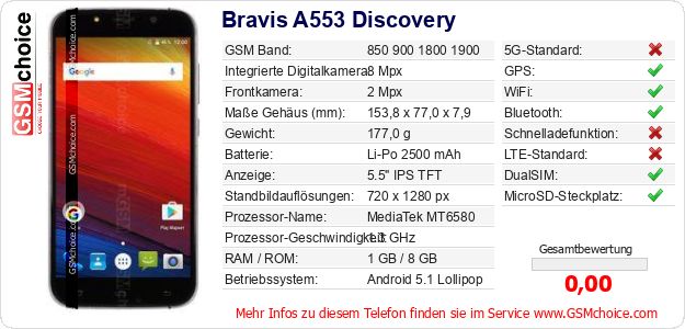 Daten des Mobiltelefons Bravis A553 Discovery auf Ihrer Seite
