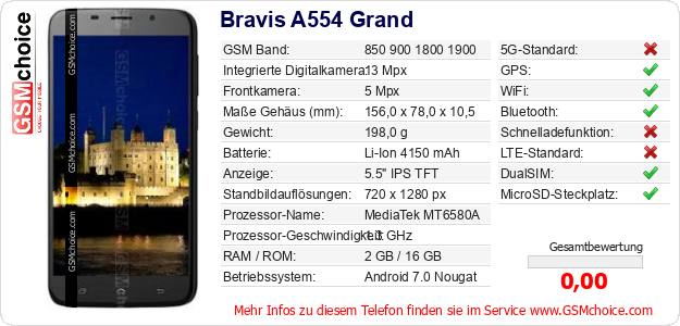 Hast du eigene Webseite? Willst du die Informationen über Standarddaten des Handys Bravis A554 Grand irgendwo veröffentlichen? Das ist sehr einfach. Du kannst das Bild herunterladen oder kopieren und auf der Webseite folgenden Code hinzufügen:Das Einfügen von diesem Code verursacht das Anzeigen von dem folgenden Bild: