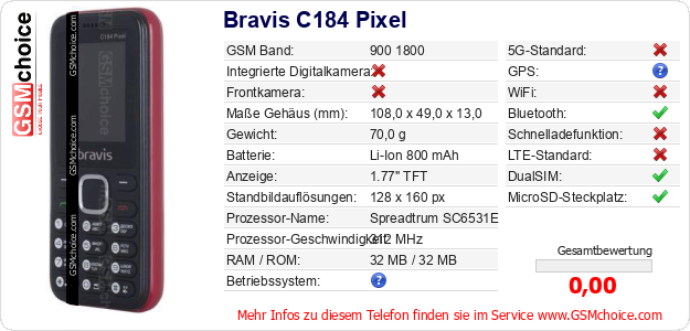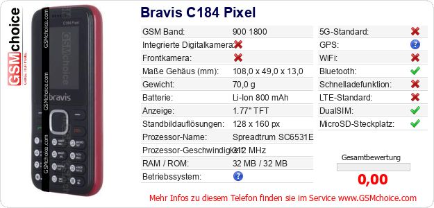 Hast du eigene Webseite? Willst du die Informationen über Standarddaten des Handys Bravis C184 Pixel irgendwo veröffentlichen? Das ist sehr einfach. Du kannst das Bild herunterladen oder kopieren und auf der Webseite folgenden Code hinzufügen:Das Einfügen von diesem Code verursacht das Anzeigen von dem folgenden Bild: