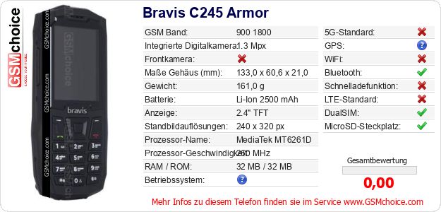 Daten des Mobiltelefons Bravis C245 Armor auf Ihrer Seite