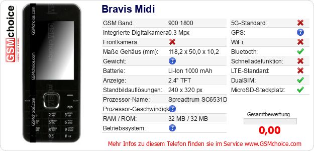 Hast du eigene Webseite? Willst du die Informationen über Standarddaten des Handys Bravis Midi irgendwo veröffentlichen? Das ist sehr einfach. Du kannst das Bild herunterladen oder kopieren und auf der Webseite folgenden Code hinzufügen:Das Einfügen von diesem Code verursacht das Anzeigen von dem folgenden Bild: