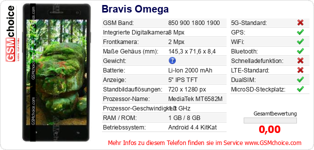 Hast du eigene Webseite? Willst du die Informationen über Standarddaten des Handys Bravis Omega irgendwo veröffentlichen? Das ist sehr einfach. Du kannst das Bild herunterladen oder kopieren und auf der Webseite folgenden Code hinzufügen:Das Einfügen von diesem Code verursacht das Anzeigen von dem folgenden Bild: