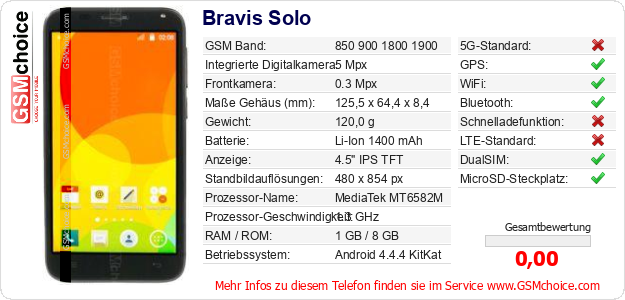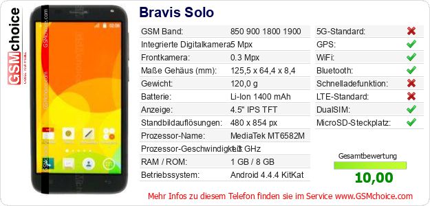 Hast du eigene Webseite? Willst du die Informationen über Standarddaten des Handys Bravis Solo irgendwo veröffentlichen? Das ist sehr einfach. Du kannst das Bild herunterladen oder kopieren und auf der Webseite folgenden Code hinzufügen:Das Einfügen von diesem Code verursacht das Anzeigen von dem folgenden Bild:
