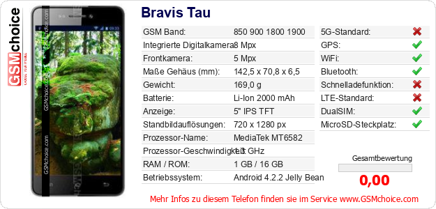 Hast du eigene Webseite? Willst du die Informationen über Standarddaten des Handys Bravis Tau irgendwo veröffentlichen? Das ist sehr einfach. Du kannst das Bild herunterladen oder kopieren und auf der Webseite folgenden Code hinzufügen:Das Einfügen von diesem Code verursacht das Anzeigen von dem folgenden Bild: