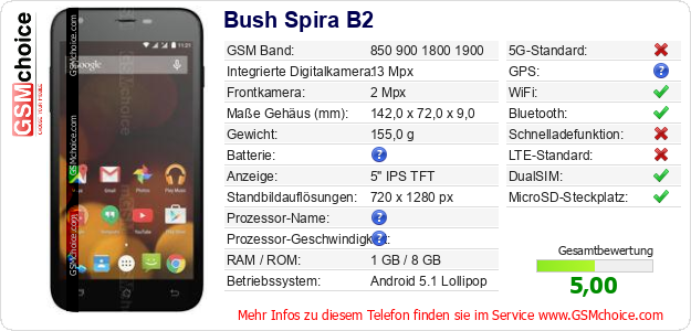 Hast du eigene Webseite? Willst du die Informationen über Standarddaten des Handys Bush Spira B2 irgendwo veröffentlichen? Das ist sehr einfach. Du kannst das Bild herunterladen oder kopieren und auf der Webseite folgenden Code hinzufügen:Das Einfügen von diesem Code verursacht das Anzeigen von dem folgenden Bild: