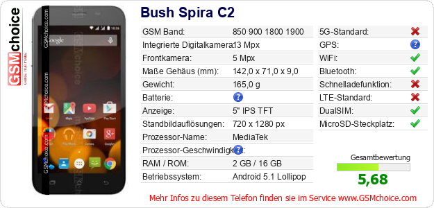 Hast du eigene Webseite? Willst du die Informationen über Standarddaten des Handys Bush Spira C2 irgendwo veröffentlichen? Das ist sehr einfach. Du kannst das Bild herunterladen oder kopieren und auf der Webseite folgenden Code hinzufügen:Das Einfügen von diesem Code verursacht das Anzeigen von dem folgenden Bild: