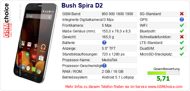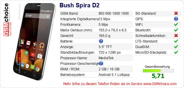 Hast du eigene Webseite? Willst du die Informationen über Standarddaten des Handys Bush Spira D2 irgendwo veröffentlichen? Das ist sehr einfach. Du kannst das Bild herunterladen oder kopieren und auf der Webseite folgenden Code hinzufügen:Das Einfügen von diesem Code verursacht das Anzeigen von dem folgenden Bild:
