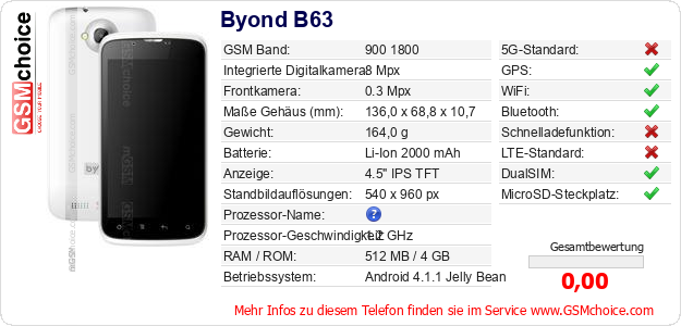 Hast du eigene Webseite? Willst du die Informationen über Standarddaten des Handys Byond B63 irgendwo veröffentlichen? Das ist sehr einfach. Du kannst das Bild herunterladen oder kopieren und auf der Webseite folgenden Code hinzufügen:Das Einfügen von diesem Code verursacht das Anzeigen von dem folgenden Bild: