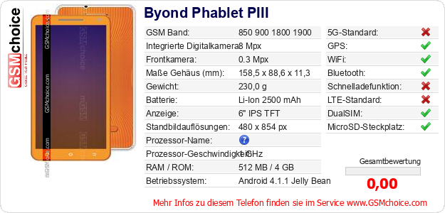 Hast du eigene Webseite? Willst du die Informationen über Standarddaten des Handys Byond Phablet PIII irgendwo veröffentlichen? Das ist sehr einfach. Du kannst das Bild herunterladen oder kopieren und auf der Webseite folgenden Code hinzufügen:Das Einfügen von diesem Code verursacht das Anzeigen von dem folgenden Bild: