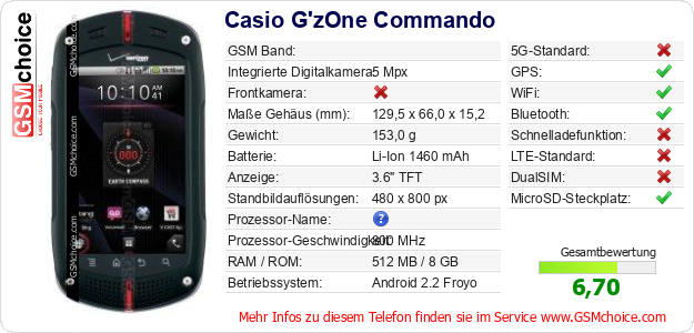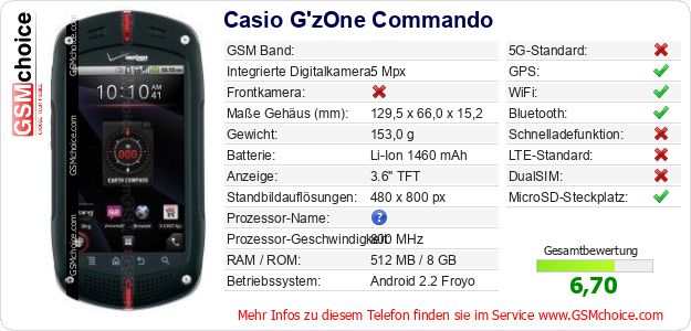Hast du eigene Webseite? Willst du die Informationen über Standarddaten des Handys Casio G'zOne Commando irgendwo veröffentlichen? Das ist sehr einfach. Du kannst das Bild herunterladen oder kopieren und auf der Webseite folgenden Code hinzufügen:Das Einfügen von diesem Code verursacht das Anzeigen von dem folgenden Bild: