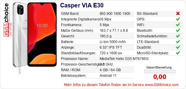 Hast du eigene Webseite? Willst du die Informationen über Standarddaten des Handys Casper VIA E30 irgendwo veröffentlichen? Das ist sehr einfach. Du kannst das Bild herunterladen oder kopieren und auf der Webseite folgenden Code hinzufügen:Das Einfügen von diesem Code verursacht das Anzeigen von dem folgenden Bild: