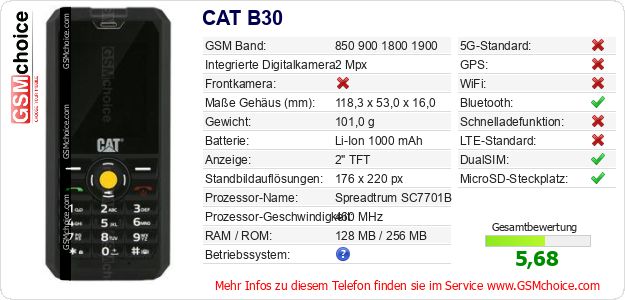 Hast du eigene Webseite? Willst du die Informationen über Standarddaten des Handys CAT B30 irgendwo veröffentlichen? Das ist sehr einfach. Du kannst das Bild herunterladen oder kopieren und auf der Webseite folgenden Code hinzufügen:Das Einfügen von diesem Code verursacht das Anzeigen von dem folgenden Bild:
