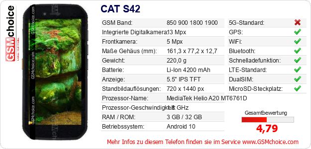 Hast du eigene Webseite? Willst du die Informationen über Standarddaten des Handys CAT S42 irgendwo veröffentlichen? Das ist sehr einfach. Du kannst das Bild herunterladen oder kopieren und auf der Webseite folgenden Code hinzufügen:Das Einfügen von diesem Code verursacht das Anzeigen von dem folgenden Bild: