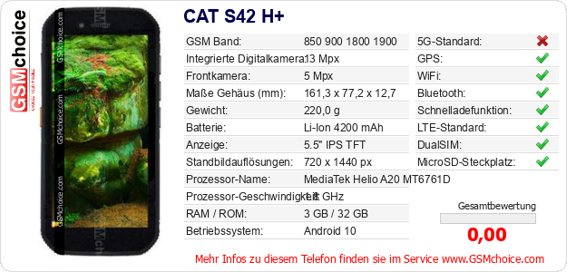 Hast du eigene Webseite? Willst du die Informationen über Standarddaten des Handys CAT S42 H+ irgendwo veröffentlichen? Das ist sehr einfach. Du kannst das Bild herunterladen oder kopieren und auf der Webseite folgenden Code hinzufügen:Das Einfügen von diesem Code verursacht das Anzeigen von dem folgenden Bild: