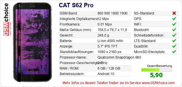 Hast du eigene Webseite? Willst du die Informationen über Standarddaten des Handys CAT S62 Pro irgendwo veröffentlichen? Das ist sehr einfach. Du kannst das Bild herunterladen oder kopieren und auf der Webseite folgenden Code hinzufügen:Das Einfügen von diesem Code verursacht das Anzeigen von dem folgenden Bild: