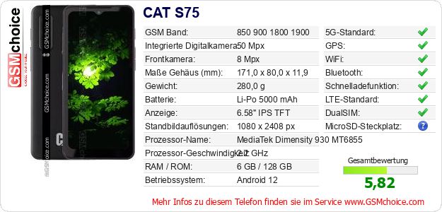 Hast du eigene Webseite? Willst du die Informationen über Standarddaten des Handys CAT S75 irgendwo veröffentlichen? Das ist sehr einfach. Du kannst das Bild herunterladen oder kopieren und auf der Webseite folgenden Code hinzufügen:Das Einfügen von diesem Code verursacht das Anzeigen von dem folgenden Bild: