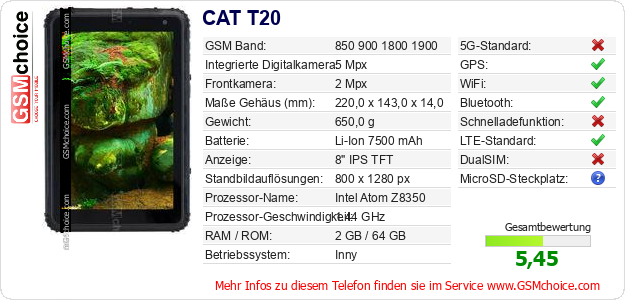 Hast du eigene Webseite? Willst du die Informationen über Standarddaten des Handys CAT T20 irgendwo veröffentlichen? Das ist sehr einfach. Du kannst das Bild herunterladen oder kopieren und auf der Webseite folgenden Code hinzufügen:Das Einfügen von diesem Code verursacht das Anzeigen von dem folgenden Bild: