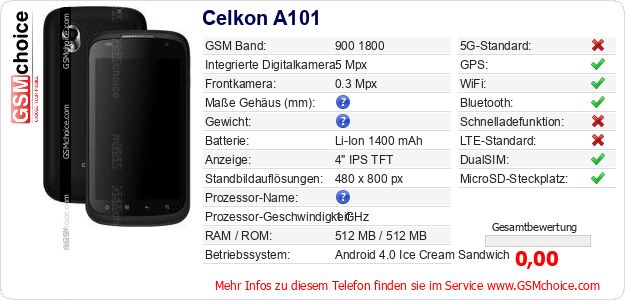Hast du eigene Webseite? Willst du die Informationen über Standarddaten des Handys Celkon A101 irgendwo veröffentlichen? Das ist sehr einfach. Du kannst das Bild herunterladen oder kopieren und auf der Webseite folgenden Code hinzufügen:Das Einfügen von diesem Code verursacht das Anzeigen von dem folgenden Bild: