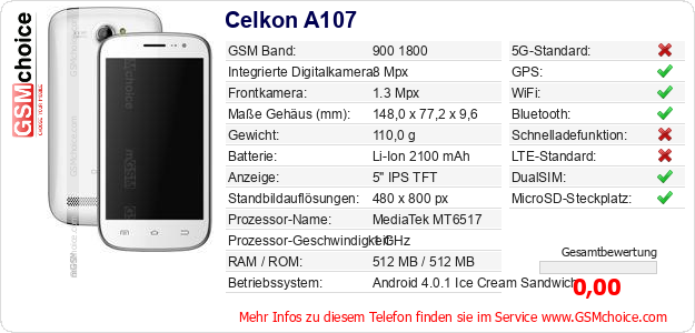 Hast du eigene Webseite? Willst du die Informationen über Standarddaten des Handys Celkon A107 irgendwo veröffentlichen? Das ist sehr einfach. Du kannst das Bild herunterladen oder kopieren und auf der Webseite folgenden Code hinzufügen:Das Einfügen von diesem Code verursacht das Anzeigen von dem folgenden Bild:
