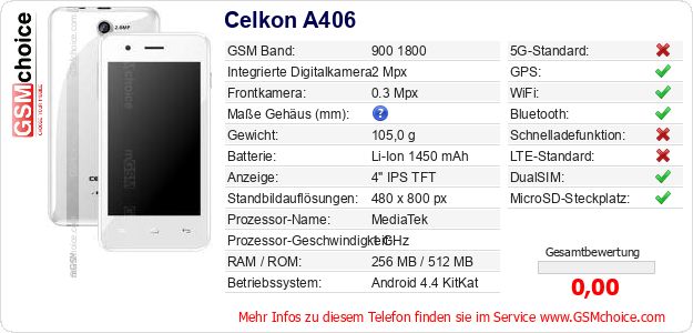 Hast du eigene Webseite? Willst du die Informationen über Standarddaten des Handys Celkon A406 irgendwo veröffentlichen? Das ist sehr einfach. Du kannst das Bild herunterladen oder kopieren und auf der Webseite folgenden Code hinzufügen:Das Einfügen von diesem Code verursacht das Anzeigen von dem folgenden Bild: