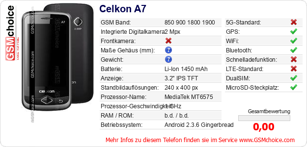 Hast du eigene Webseite? Willst du die Informationen über Standarddaten des Handys Celkon A7 irgendwo veröffentlichen? Das ist sehr einfach. Du kannst das Bild herunterladen oder kopieren und auf der Webseite folgenden Code hinzufügen:Das Einfügen von diesem Code verursacht das Anzeigen von dem folgenden Bild: