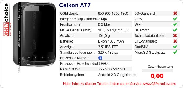 Hast du eigene Webseite? Willst du die Informationen über Standarddaten des Handys Celkon A77 irgendwo veröffentlichen? Das ist sehr einfach. Du kannst das Bild herunterladen oder kopieren und auf der Webseite folgenden Code hinzufügen:Das Einfügen von diesem Code verursacht das Anzeigen von dem folgenden Bild:
