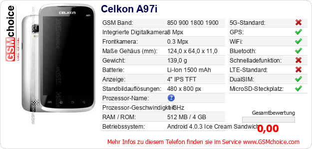 Hast du eigene Webseite? Willst du die Informationen über Standarddaten des Handys Celkon A97i irgendwo veröffentlichen? Das ist sehr einfach. Du kannst das Bild herunterladen oder kopieren und auf der Webseite folgenden Code hinzufügen:Das Einfügen von diesem Code verursacht das Anzeigen von dem folgenden Bild: