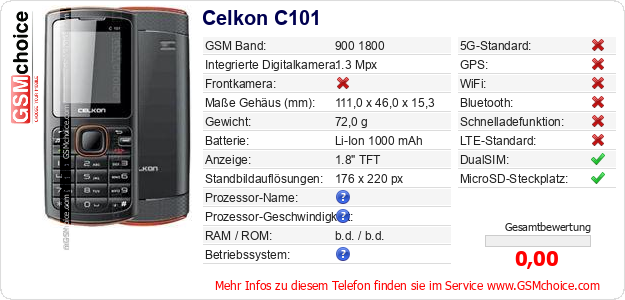Hast du eigene Webseite? Willst du die Informationen über Standarddaten des Handys Celkon C101 irgendwo veröffentlichen? Das ist sehr einfach. Du kannst das Bild herunterladen oder kopieren und auf der Webseite folgenden Code hinzufügen:Das Einfügen von diesem Code verursacht das Anzeigen von dem folgenden Bild: