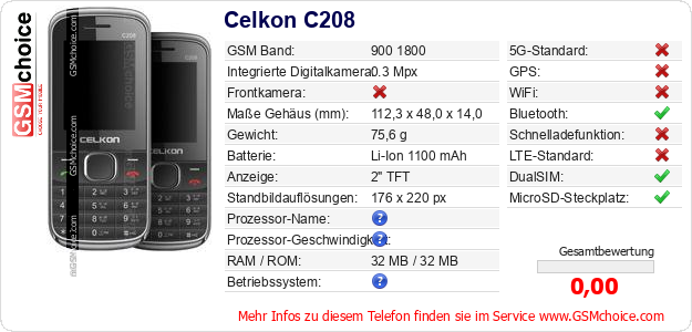 Hast du eigene Webseite? Willst du die Informationen über Standarddaten des Handys Celkon C208 irgendwo veröffentlichen? Das ist sehr einfach. Du kannst das Bild herunterladen oder kopieren und auf der Webseite folgenden Code hinzufügen:Das Einfügen von diesem Code verursacht das Anzeigen von dem folgenden Bild: