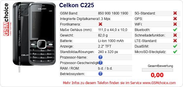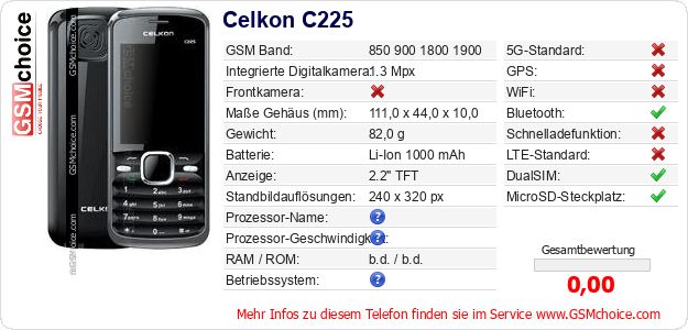 Hast du eigene Webseite? Willst du die Informationen über Standarddaten des Handys Celkon C225 irgendwo veröffentlichen? Das ist sehr einfach. Du kannst das Bild herunterladen oder kopieren und auf der Webseite folgenden Code hinzufügen:Das Einfügen von diesem Code verursacht das Anzeigen von dem folgenden Bild: