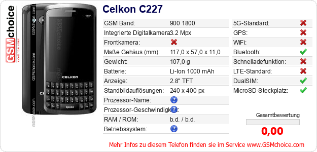 Hast du eigene Webseite? Willst du die Informationen über Standarddaten des Handys Celkon C227 irgendwo veröffentlichen? Das ist sehr einfach. Du kannst das Bild herunterladen oder kopieren und auf der Webseite folgenden Code hinzufügen:Das Einfügen von diesem Code verursacht das Anzeigen von dem folgenden Bild:
