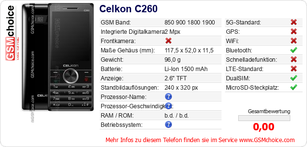 Hast du eigene Webseite? Willst du die Informationen über Standarddaten des Handys Celkon C260 irgendwo veröffentlichen? Das ist sehr einfach. Du kannst das Bild herunterladen oder kopieren und auf der Webseite folgenden Code hinzufügen:Das Einfügen von diesem Code verursacht das Anzeigen von dem folgenden Bild: