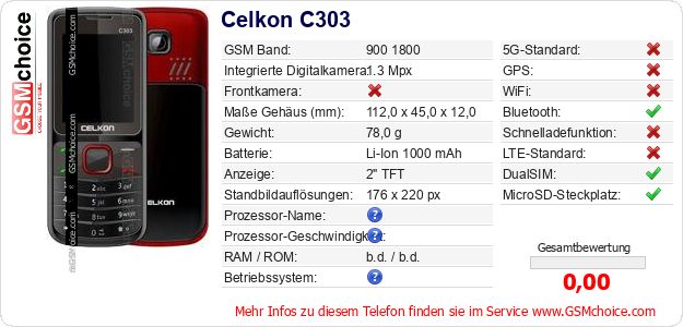 Hast du eigene Webseite? Willst du die Informationen über Standarddaten des Handys Celkon C303 irgendwo veröffentlichen? Das ist sehr einfach. Du kannst das Bild herunterladen oder kopieren und auf der Webseite folgenden Code hinzufügen:Das Einfügen von diesem Code verursacht das Anzeigen von dem folgenden Bild: