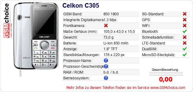 Hast du eigene Webseite? Willst du die Informationen über Standarddaten des Handys Celkon C305 irgendwo veröffentlichen? Das ist sehr einfach. Du kannst das Bild herunterladen oder kopieren und auf der Webseite folgenden Code hinzufügen:Das Einfügen von diesem Code verursacht das Anzeigen von dem folgenden Bild: