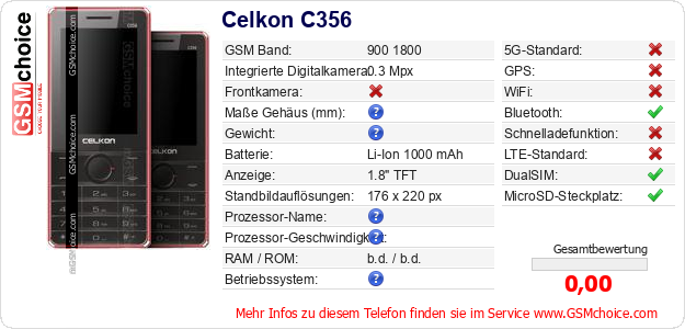 Hast du eigene Webseite? Willst du die Informationen über Standarddaten des Handys Celkon C356 irgendwo veröffentlichen? Das ist sehr einfach. Du kannst das Bild herunterladen oder kopieren und auf der Webseite folgenden Code hinzufügen:Das Einfügen von diesem Code verursacht das Anzeigen von dem folgenden Bild: