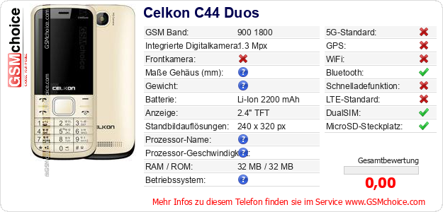 Hast du eigene Webseite? Willst du die Informationen über Standarddaten des Handys Celkon C44 Duos irgendwo veröffentlichen? Das ist sehr einfach. Du kannst das Bild herunterladen oder kopieren und auf der Webseite folgenden Code hinzufügen:Das Einfügen von diesem Code verursacht das Anzeigen von dem folgenden Bild: