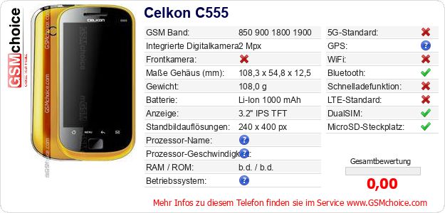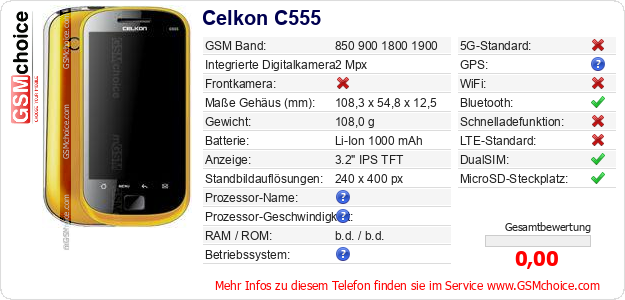 Hast du eigene Webseite? Willst du die Informationen über Standarddaten des Handys Celkon C555 irgendwo veröffentlichen? Das ist sehr einfach. Du kannst das Bild herunterladen oder kopieren und auf der Webseite folgenden Code hinzufügen:Das Einfügen von diesem Code verursacht das Anzeigen von dem folgenden Bild: