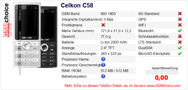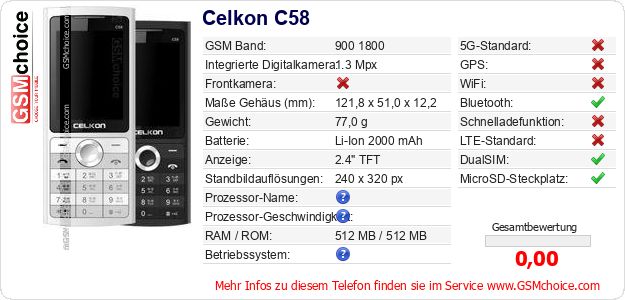 Hast du eigene Webseite? Willst du die Informationen über Standarddaten des Handys Celkon C58 irgendwo veröffentlichen? Das ist sehr einfach. Du kannst das Bild herunterladen oder kopieren und auf der Webseite folgenden Code hinzufügen:Das Einfügen von diesem Code verursacht das Anzeigen von dem folgenden Bild: