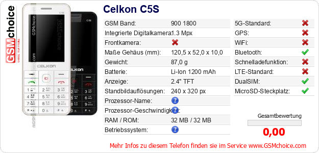 Hast du eigene Webseite? Willst du die Informationen über Standarddaten des Handys Celkon C5S irgendwo veröffentlichen? Das ist sehr einfach. Du kannst das Bild herunterladen oder kopieren und auf der Webseite folgenden Code hinzufügen:Das Einfügen von diesem Code verursacht das Anzeigen von dem folgenden Bild: