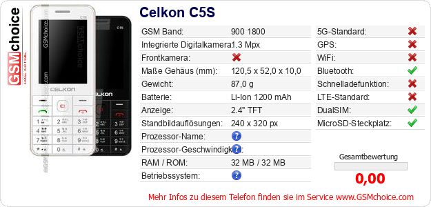 Daten des Mobiltelefons Celkon C5S auf Ihrer Seite