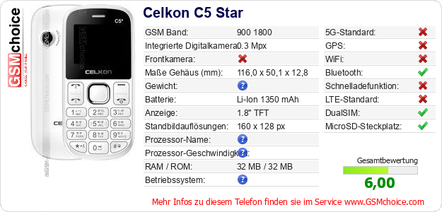 Hast du eigene Webseite? Willst du die Informationen über Standarddaten des Handys Celkon C5 Star irgendwo veröffentlichen? Das ist sehr einfach. Du kannst das Bild herunterladen oder kopieren und auf der Webseite folgenden Code hinzufügen:Das Einfügen von diesem Code verursacht das Anzeigen von dem folgenden Bild: