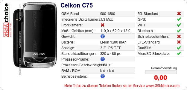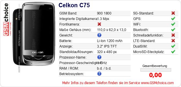 Hast du eigene Webseite? Willst du die Informationen über Standarddaten des Handys Celkon C75 irgendwo veröffentlichen? Das ist sehr einfach. Du kannst das Bild herunterladen oder kopieren und auf der Webseite folgenden Code hinzufügen:Das Einfügen von diesem Code verursacht das Anzeigen von dem folgenden Bild: